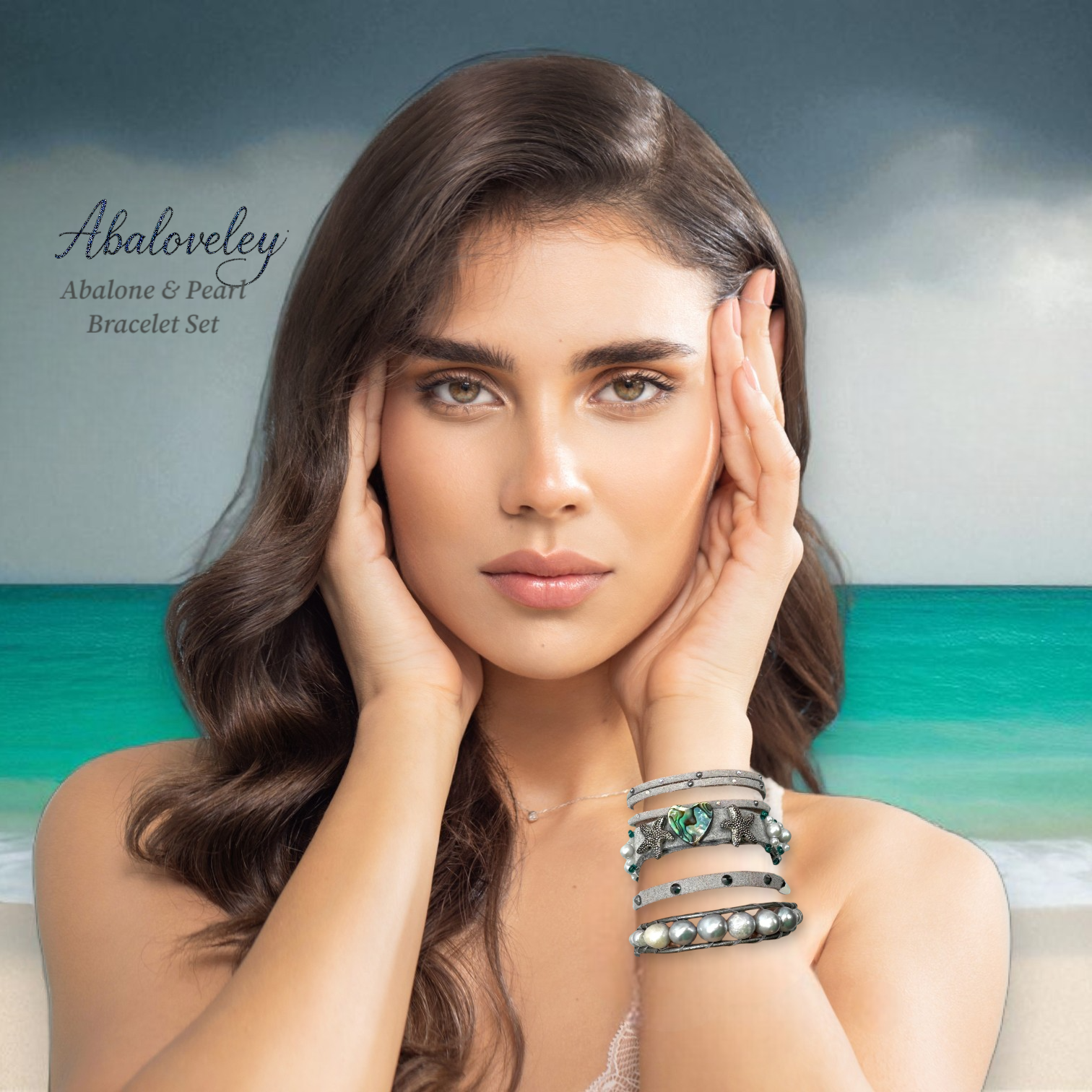 Dove Grey Abalone and Grey Pearl Themed bracelets.- 1. Wide Wrap w/ Antique Silver Starfish & Abaloney heart Focal, Cascading Pearls, & Zircon Czech beads. 2. Reversible- w/ the Highest Quality Austrian Crystal Studs on one side and Dove Grey Pearls on the other. 3. Skinny triple wrap w/ alt. tiny Austrian crystal studs and tiny grey flat back pearls 4. Abalovely Bohemian Wrapsody w/ Dark Metallic Grey Leather, Large Grey Cultured Pearls, and Antique Silver beads. Each sold seperately or 20% Discount for the whole collection! WE OFFER FREE SHIPPING ON EVERY ORDER!