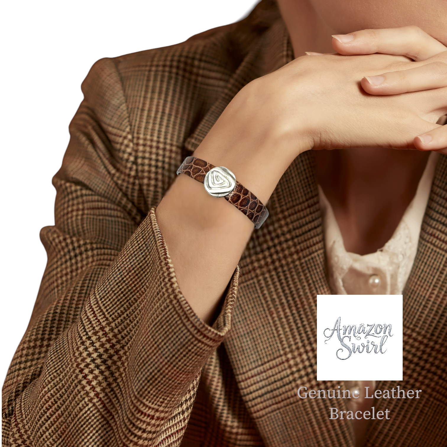 The Amazon Swirl Alligator Print Leather Bracelet brings bold texture and artisan detail together in a stunning everyday accessory. Crafted from genuine brown leather embossed with a rich alligator pattern, this bracelet features an antique silver swirl slider that adds a touch of refined movement and visual interest. The high-quality leather is soft yet durable, offering both comfort and longevity, while the magnetic clasp ensures secure and effortless wear. Unique, stylish, and handcrafted, this bracelet is perfect for those who appreciate textured leather, earthy tones, and meaningful artisan jewelry.