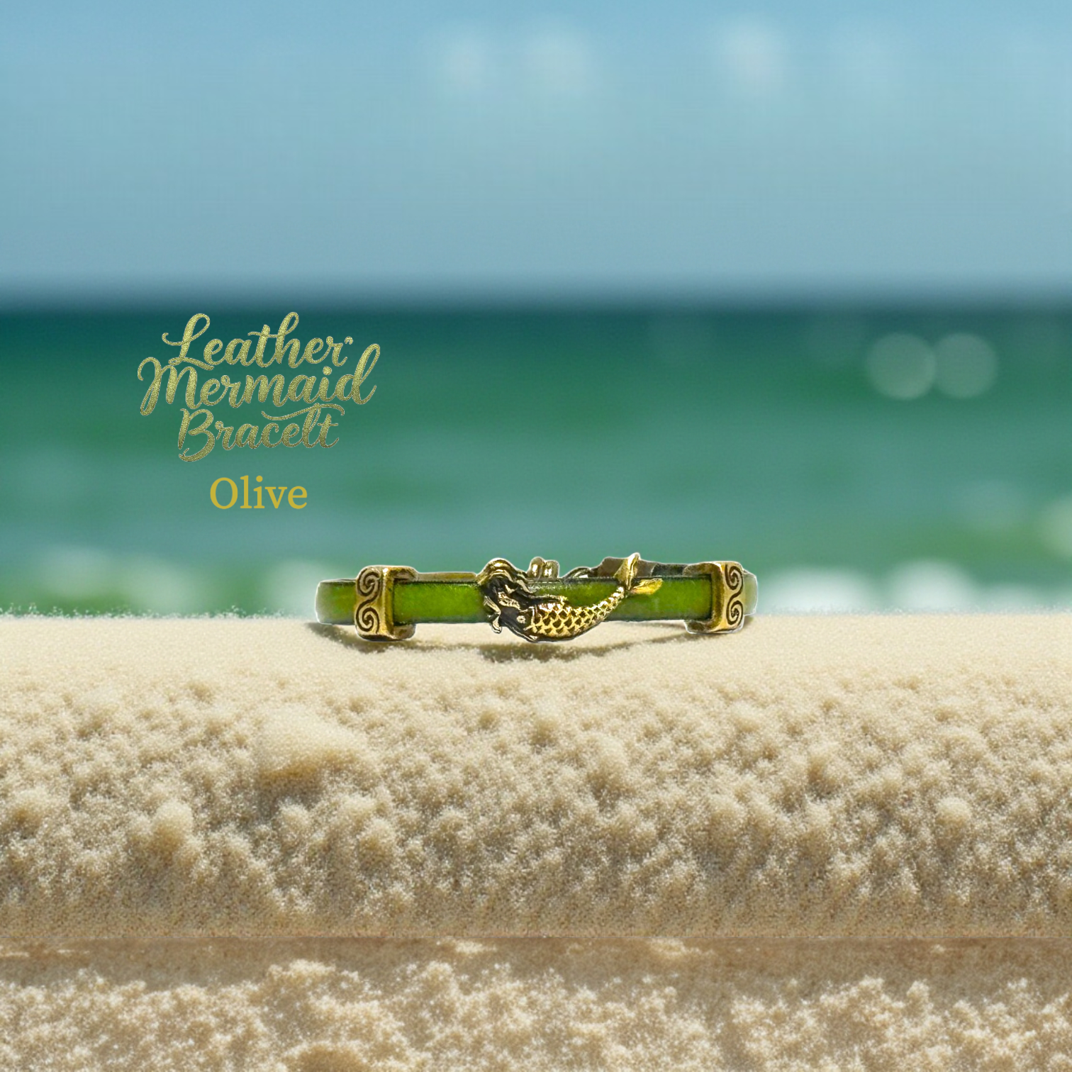 Leather Mermaid Genuine Olive Leather with aAntique Bronze Mermaid and 2 Wave Bar sliders. Bronze Magnet fastener.