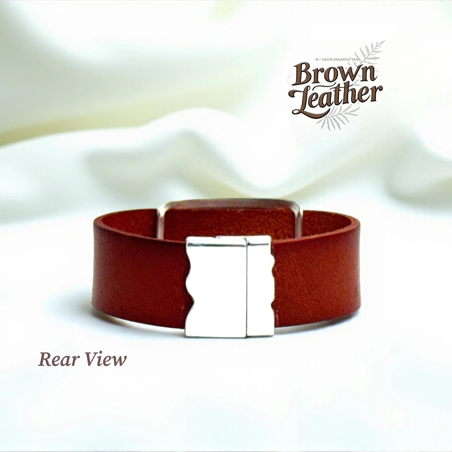 The Brown Leather Bracelet with Engraved Silver Fern Slider is a statement piece for those who love earthy elegance and artisan style. Crafted from a wide band of genuine chestnut brown leather, this bracelet features a beautifully engraved antique silver fern slider that brings a touch of natural symbolism and refined detail. The rich leather offers a soft yet durable feel, while the secure magnetic closure ensures a comfortable, effortless fit. This bracelet blends rustic charm with sophisticated craftsmanship, making it perfect for everyday wear, nature lovers, and anyone who appreciates bold, meaningful accessories.