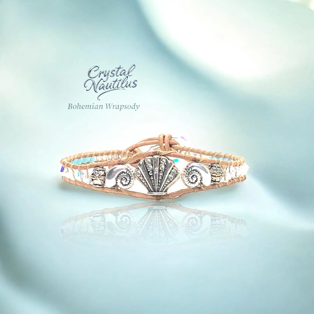 6. Bohemian Wrapsody: Genuine leather with an antique silver nautilus focal, crystal-studded shell, clear Austrian Crystal bi-cones, and Sea Foam glass squares.