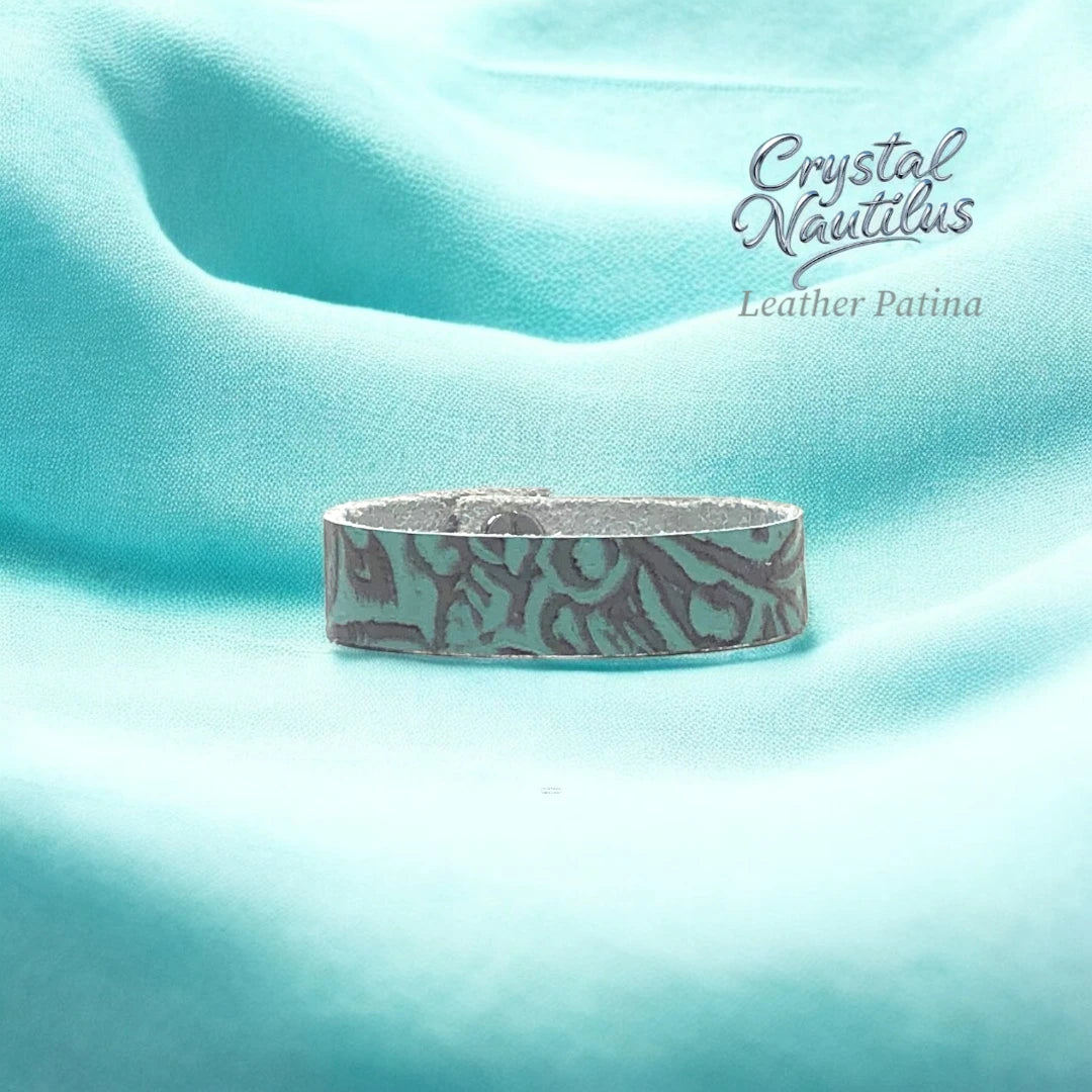 7. New! Aquamarine Leather Bracelet w/ Antique Silver Nautilus and Accent Sliders.