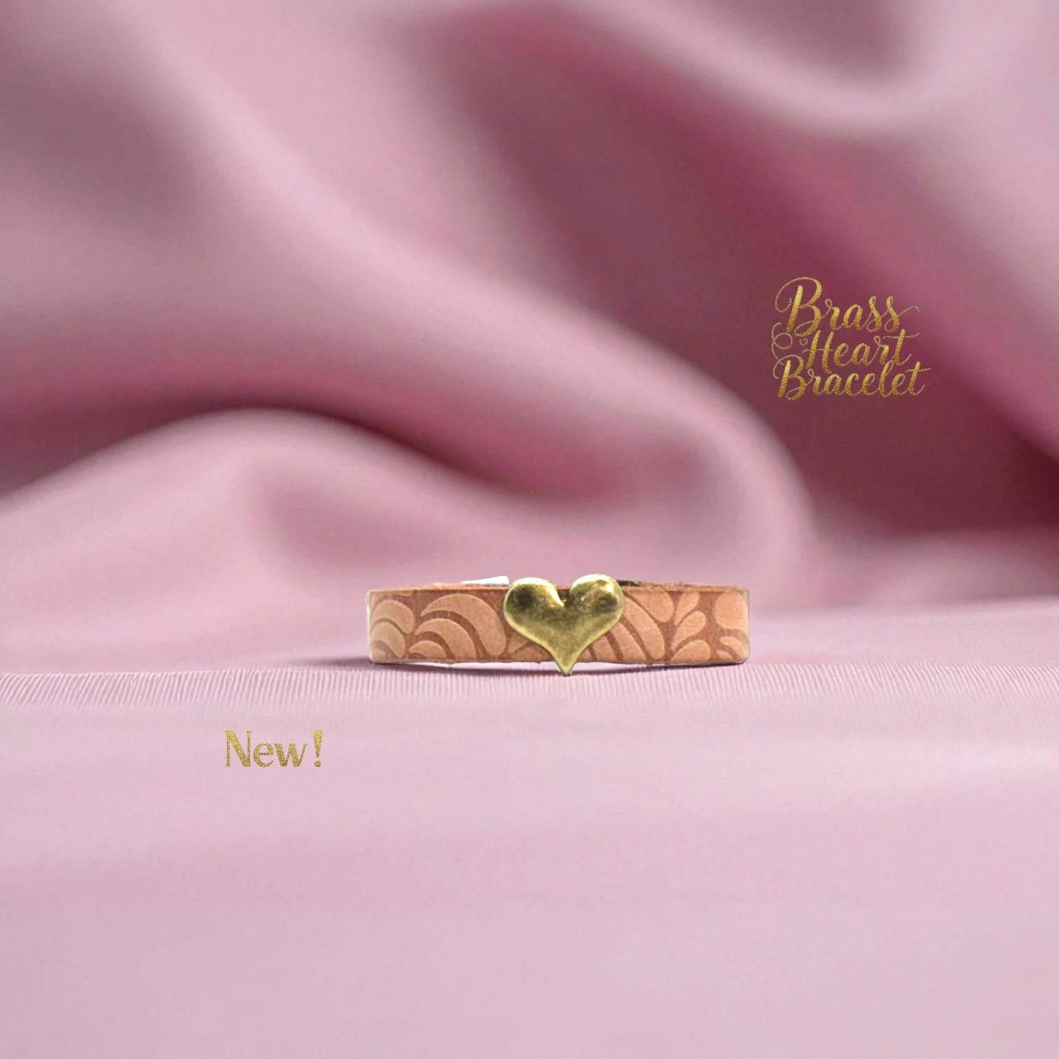 Beautiful Genuine Floral Embossed bracelet with a voluptuous brass Heart Focal slider .