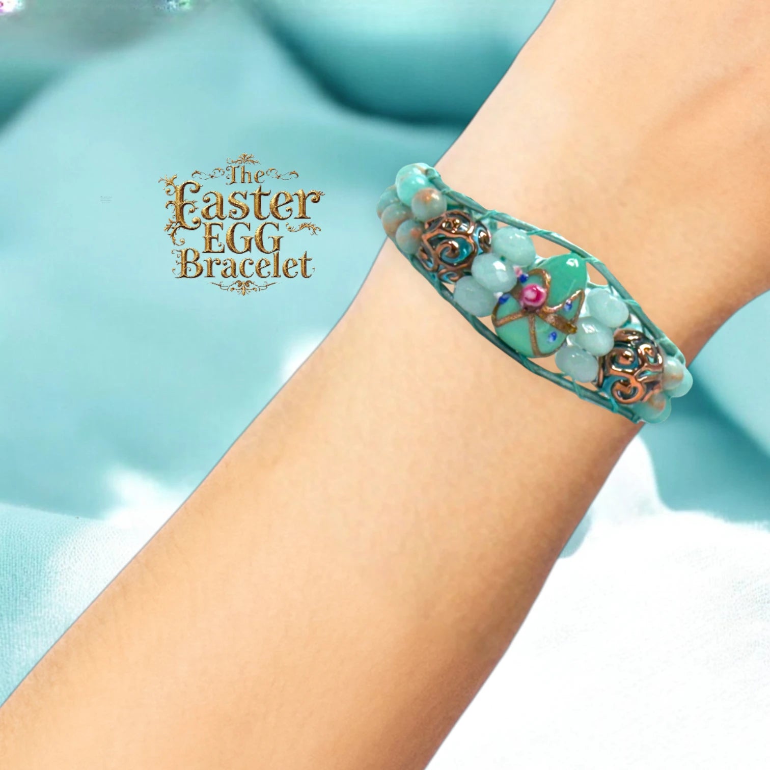 Bohemian Wrapsody Easter Egg Bracelet – Featuring light metallic Easter blue genuine leather, adorned with a handmade Fabergé Style Egg, Emperor Rose Gold Scroll Lampwork beads, Amazonite, Faceted Crystal, and Agate—the perfect accessory for Easter and beyond!"Beautiful Egg Bead Closure.