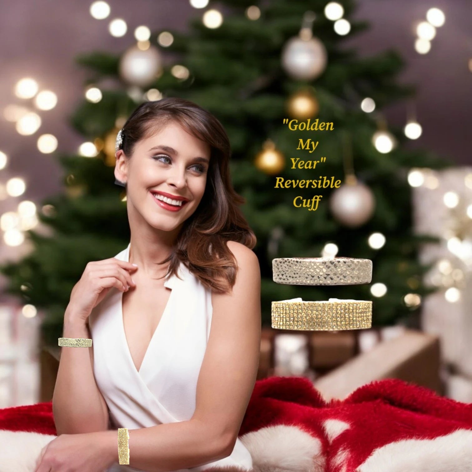 Our Bling Bracelet – “Shiny & New” Golden My Year is the perfect accessory to start your year off with a bang. This reversible cuff offers two stunning looks in one: