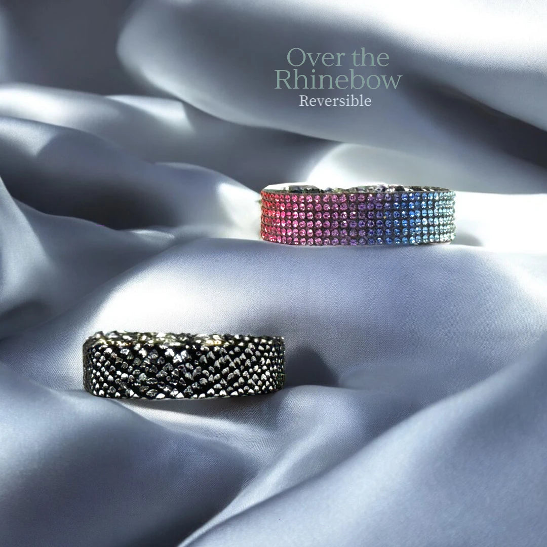 Make a statement with the Black Leather Bracelet – Shiny & New Over the Rhinebow, a reversible cuff that lets you switch up your style effortlessly. One side dazzles with sparkling rhinestones in a spectrum of rainbow shades, adding a bold and vibrant touch to any outfit. Flip it over, and you'll find a sleek, soft black faux leather with an elegant metallic silver snakeskin pattern for a more refined, edgy look. Designed for versatility and comfort, this bracelet features a secure magnetic closure, making it easy to wear and perfect for any occasion.